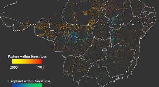 Principal Investigator: Xiao-Peng Song Co Investigators: Matthew Hansen Sponsor: NASA LCLUC Time Period: 2021 to 2023 Abstract Finding practical solutions to balance food production and environmental conservation is a grand challenge the world faces today. Extensive soybean expansion in South America, at the expense of natural vegetation, pasture and other cropland, is at the forefront of this challenge. We propose to integrate satellite observations, field measurements, economic models and an agricultural ecosystem model to quantify historical patterns of soybean expansion across South America, analyze the underlying socioeconomic drivers and project future trends. We will use Landsat, MODIS and Sentinel 2 data to characterize soybean cover and map soybean expansion from 2000 to present with continentally distributed ground data for training and validation. To understand individual landowners’ land-use decision, we will develop a spatially explicit econometric Land-Use Change (eLUC) model and use the satellite-derived soybean expansion map and other remote sensing-based land-use data to empirically calibrate the model. We will extend the Multi-Regional Input-Output analysis with soybean land footprint accounting to track the land resources embodied in the international soybean supply chain. By integrating these different observations and models, the main goal of our proposal is to improve our scientific understanding of land-cover and land-use change in South America. Related Projects: Quantifying Spatio-Temporal Trends in the Expansion of South American Agriculture, 1985 to Present Commodity Crop Mapping and Monitoring in South America Related Publications: Song, X. P., Li, H., Potapov, P., & Hansen, M. C. (2022). Annual 30 m soybean yield mapping in Brazil using long-term satellite observations, climate data and machine learning. Agricultural and Forest Meteorology, 326, 109186. Song, X.-P., Hansen, M.C., Potapov, P., Adusei, B., Pickering, J., Adami, M., Lima, A., Zalles, V., Stehman, S.V., Di Bella, C.M., Cecilia, C.M., Copati, E.J., Fernandes, L.B., Hernandez-Serna, A., Jantz, S.M., Pickens, A.H., Turubanova, S., Tyukavina A. (2021). Massive soybean expansion in South America since 2000 and implications for conservation. Nature Sustainability, 4, 784–792